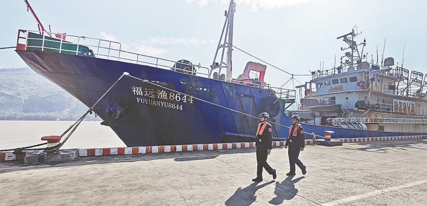 查看边检站工作人员在靠港渔船旁巡查。12月20日,随着“福远渔8644”“福远渔8635”两艘远洋渔船相继靠泊福州闽安山水码头,福州远洋渔船迎来今年的返港季。据悉,此次返港季从今年12月中旬持续至明年1月...