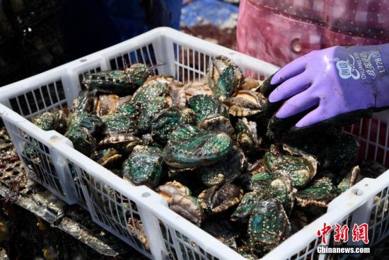 图为4月11日,渔民将鲍鱼装框过秤。