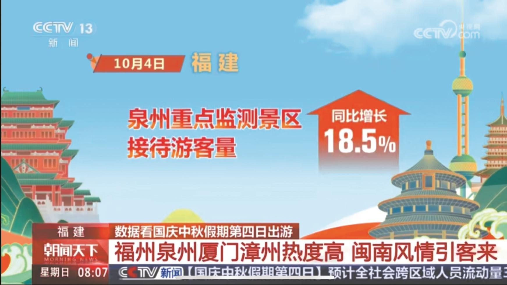 假期里,央视新闻频道《朝闻天下》多次报道泉州。昨日,该栏目播出《福建:滨海游持续火热 累计接待游客超134万人次》,其中提到惠安崇武古城等滨海旅游类景区客流较为集中。10月3日,该栏目在分析假期第二日出游情况时,特别提到福建的各类历史文化街区、古城、古镇持续火爆,其中泉州晋江五店市传统街区接待游客量同比有较大增长。10月5日,该栏目报道泉州重点监测景区接待游客量同比增长18.5%,显示出强劲势头。次日,该栏目再次在《福建:旅游热度不减 乡村游火爆》中点赞泉州梧林传统村落、北溪文苑生态旅游区等乡村游景点的突出表现。