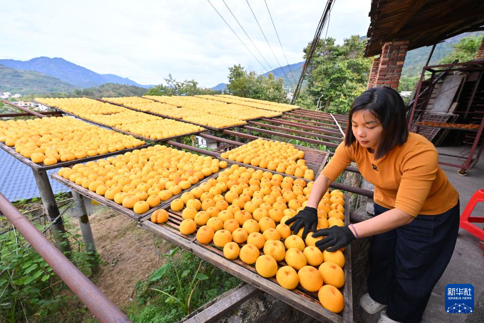 金秋送爽,福建福州市永泰县梧桐镇迎来了繁忙的柿饼加工时节,人们趁晴好天气,将削皮后的柿子摆在房前屋后晾晒,金灿灿的柿子与村落、青山相映,勾勒出秋日好“丰”景。晾晒好的柿饼圆润饱满,入口软糯,是当地传统特色美食。