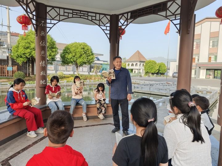 2025年4月23日,浙江衢州白沙村举办世界读书日活动,一位白沙村村民给当地小学生讲村志里的故事。新华社记者 魏董华 摄