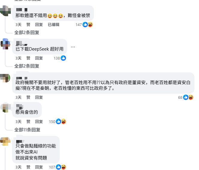 在相关新闻的评论区,有台湾网民说“重点是当局的话,我根本不信!”“开源的东西(能)说资安,当局低能”,表达对当局做法的不以为意;也有网民表示“戴着有色眼镜看东西,所有的东西都会失去原色!只有同色系的会加深吧”,直指民进党当局是戴着有色眼镜看待大陆产品;更有网民在评论区“安利”起大陆的AI模型:“已下载,很好用,感谢民进党的‘国安局’推荐”“已下载DeepSeek 超好用”。