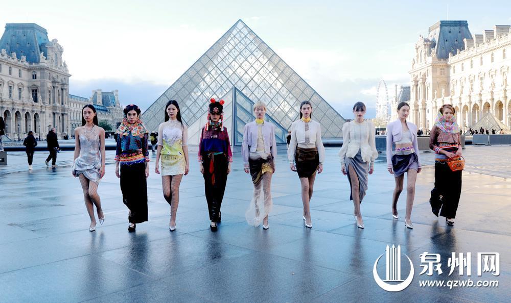 模特身穿传统惠安女服饰和改良新式惠安女服饰在巴黎卢浮宫前亮相