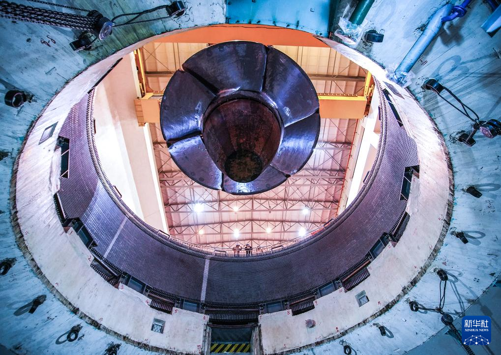 11月30日,检修人员将机组转轮吊装至安装间。新华社记者 周义 摄