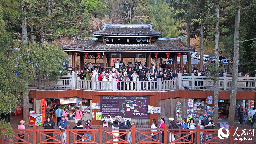 来自欧洲的旅游达人在观景台拍摄“四菜一汤”,感受福建土楼的魅力。人民网记者 李昌乾摄