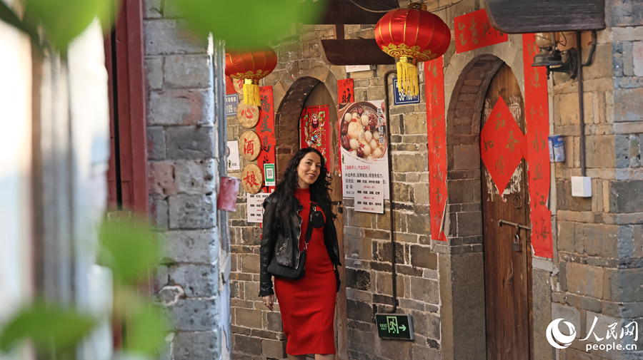 在承启楼内,红灯笼高挂,来自欧洲旅游达人打卡留影,提前感受中国年味。人民网记者 李昌乾摄