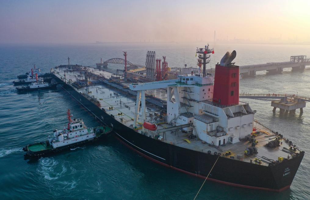2025年12月18日,海南自贸港启动全岛封关,一艘装载着17.9万吨石化原辅料的船舶泊入国投洋浦油储码头30万吨级原油泊位(无人机照片)。新华社记者 郭程 摄