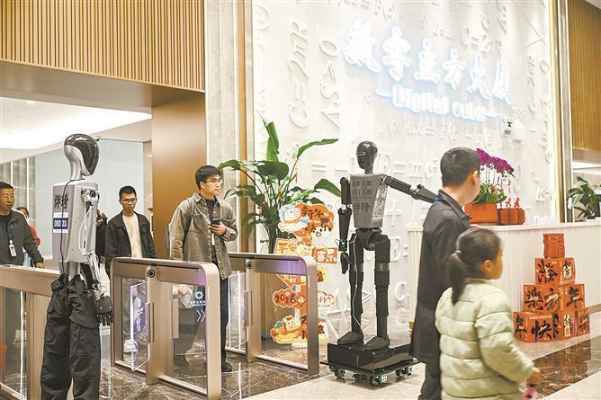 记者走进园区,步入C9大楼,同款机器人又当起了“前台”,它说:“你好,我是人形机器人‘福智’, ‘福’字取自福建,彰显闽地基因;‘智’字指向具身智能,强调感知与行动的深度融合……”