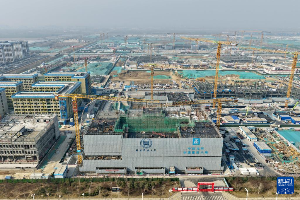 北京科技大学雄安校区建设现场(3月25日摄,无人机照片)。