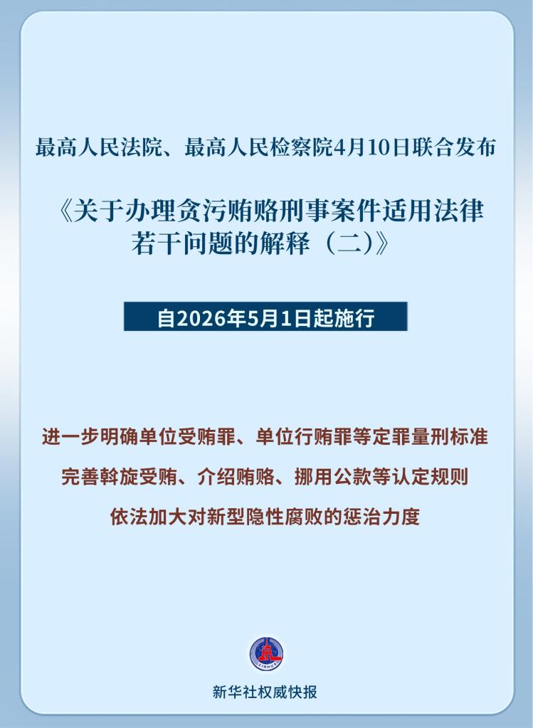 最高人民法院、最高人民检察院4月10日联合发布《关于办理贪污贿赂刑事案件适用法律若干问题的解释(二)》,自2026年5月1日起施行。