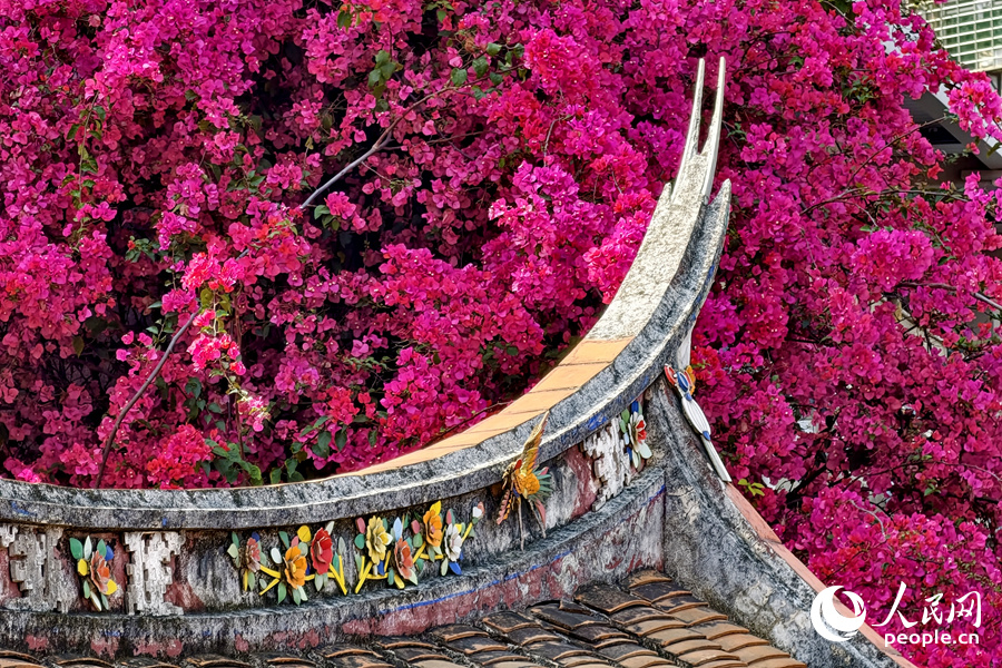 厦门祥店古厝的燕尾翘脊与三角梅相映。人民网记者 陈博摄
