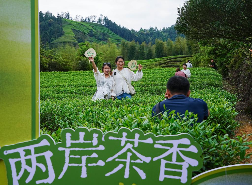 4月15日,在武夷山市星村镇的一处茶园,大家齐喊“采茶喽”。 4月15日,“两岸茶香 共游茶园”活动在福建省武夷山市星村镇举行。两岸茶人摆开茶席,邀请游客共同体验武夷茶文化,以茶为媒,持续加强交流。 新华社发(陈颖 摄) 4月15日,茶农和游客在茶山跳茶舞。新华社发(陈颖 摄) 4月15日,穿着茶服的游客在茶山体验采茶。新华社发(陈颖 摄) 4月15日,两岸茶人在福建省武夷山市星村镇一处茶园摆茶席。新华社发(陈颖 摄) 4月15日,游客在茶园拍照留影。新华社发(陈颖 摄) 上一篇 下一篇