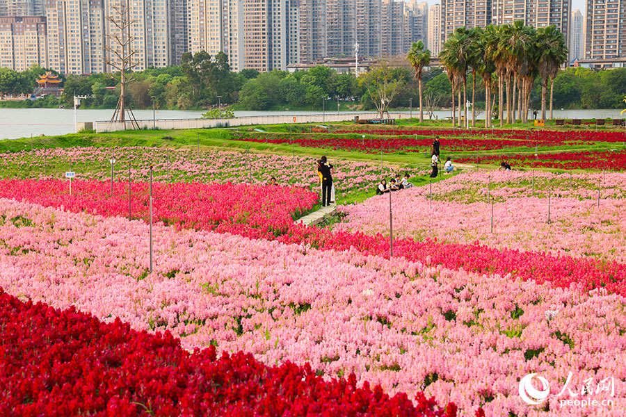 连片的橙色、粉色花田沿江铺开。人民网记者 焦艳摄