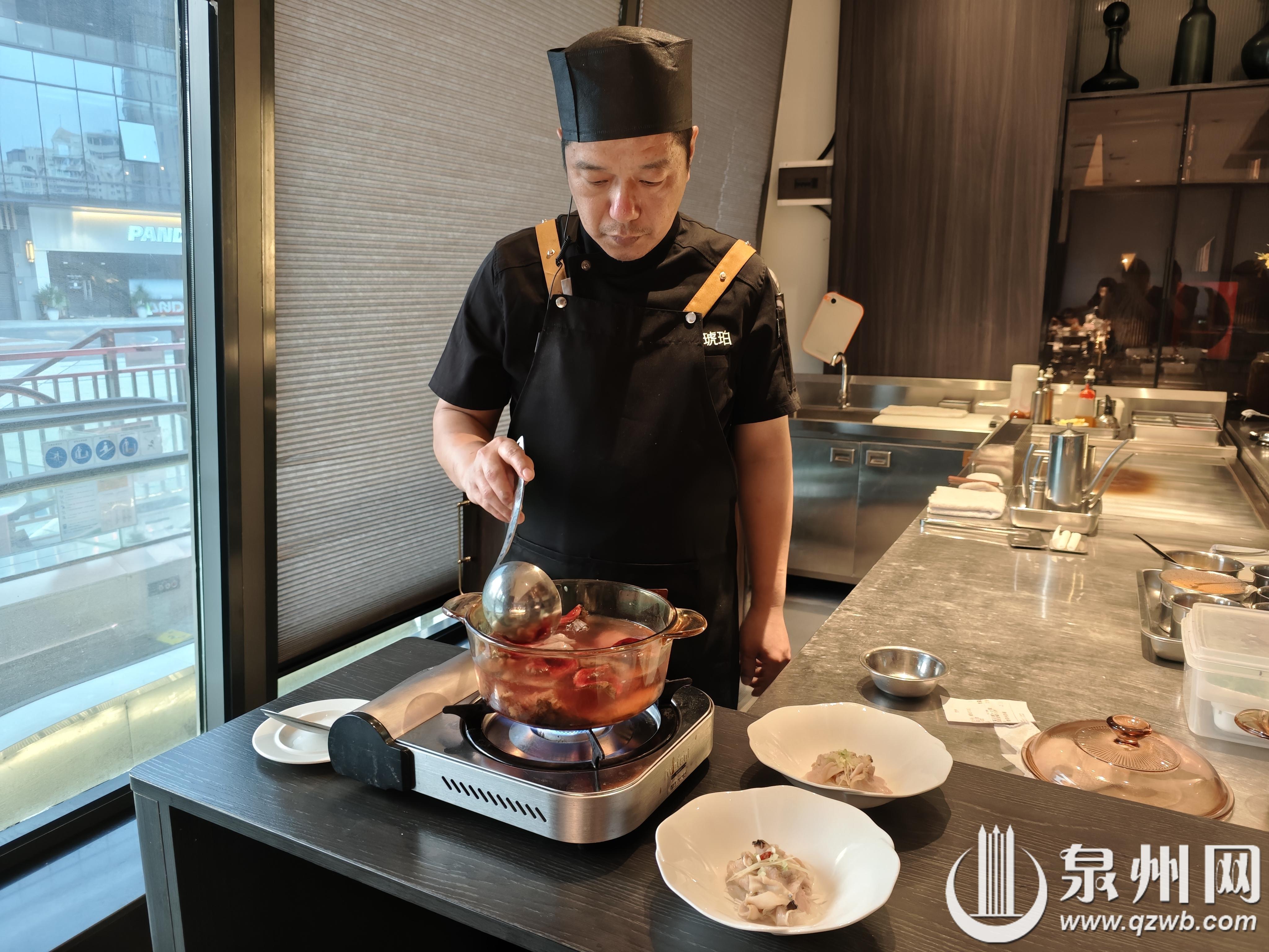 闽菜“鸡汤汆海蚌”因郑丽文的盛赞而备受关注。图为琥珀餐厅总厨吴俊雄在餐厅里为宾客们展示这道菜的烹饪技艺。