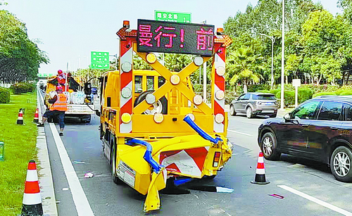 前日,在翔安大道,防撞缓冲车发挥“安全卫士”作用,保护了正在道路上作业的养护工人,也救了追尾车辆上的驾驶员及乘客。