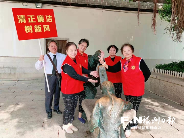 完成表演后,陈雅惠(右一)和同伴们不失童趣地围着雕塑合影。(后县社区供图)