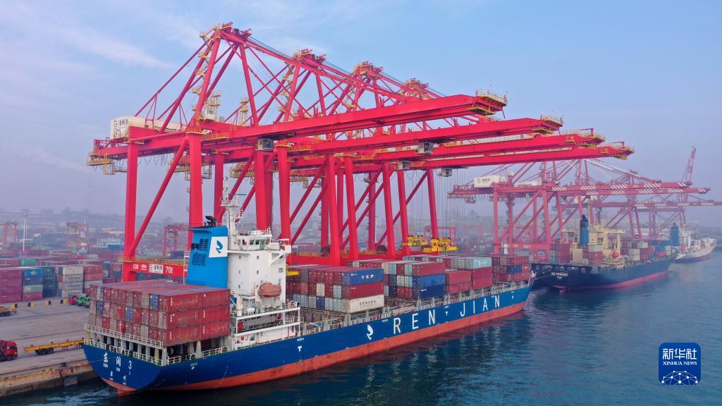 1月26日,货轮停靠在山东日照港集装箱码头进行装卸作业(无人机照片)。新华社记者 郭绪雷 摄