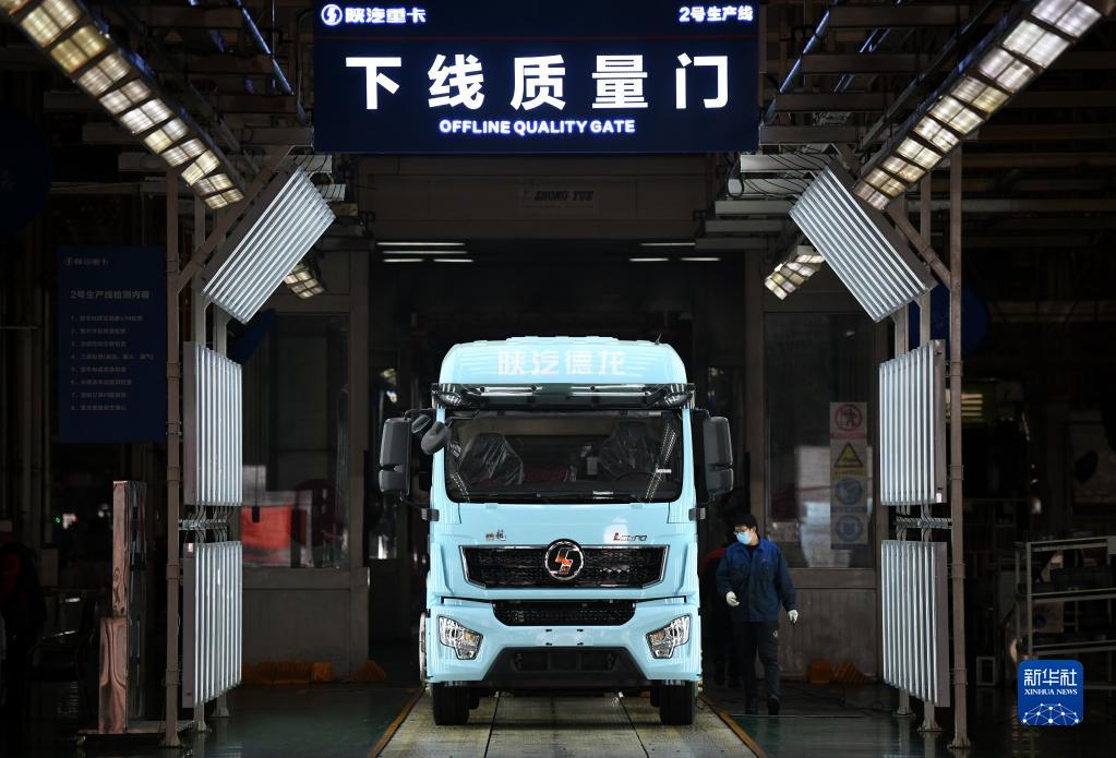 1月20日,工作人员在陕西汽车控股集团有限公司总装车间验收一辆装配完毕的重型卡车。新华社记者 李一博 摄
