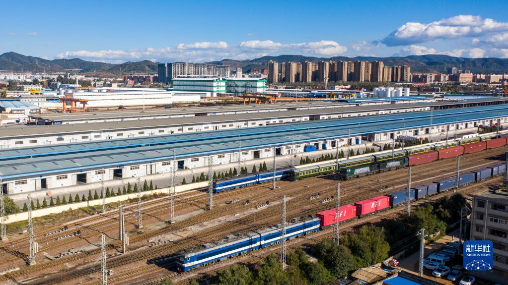 1月1日,满载30个标准集装箱的中老铁路新年首趟国际货物列车(前)从昆明开往老挝万象(无人机照片)。新华社记者 胡超 摄
