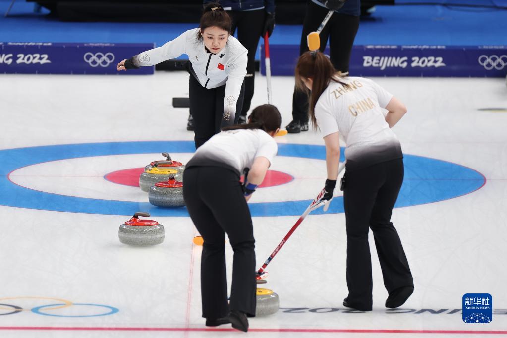 2月13日,中国队选手韩雨(上)在北京冬奥会冰壶女子循环赛中。新华社记者刘续摄