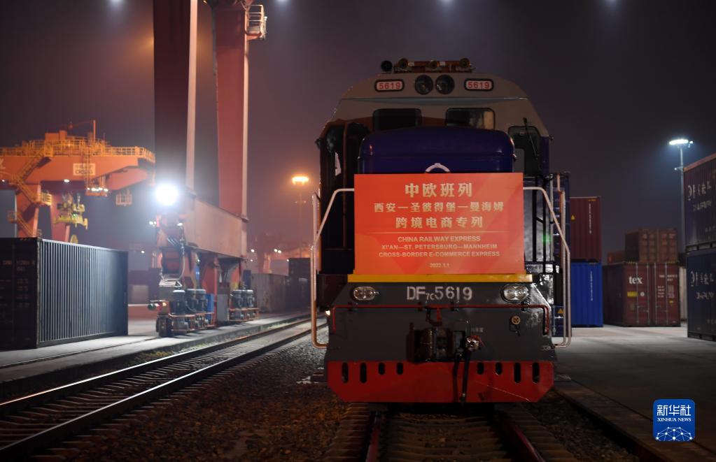 2021年12月31日晚,中欧班列长安号跨境电商专列在西安国际港站准备出发开往德国曼海姆。新华社记者 李一博 摄