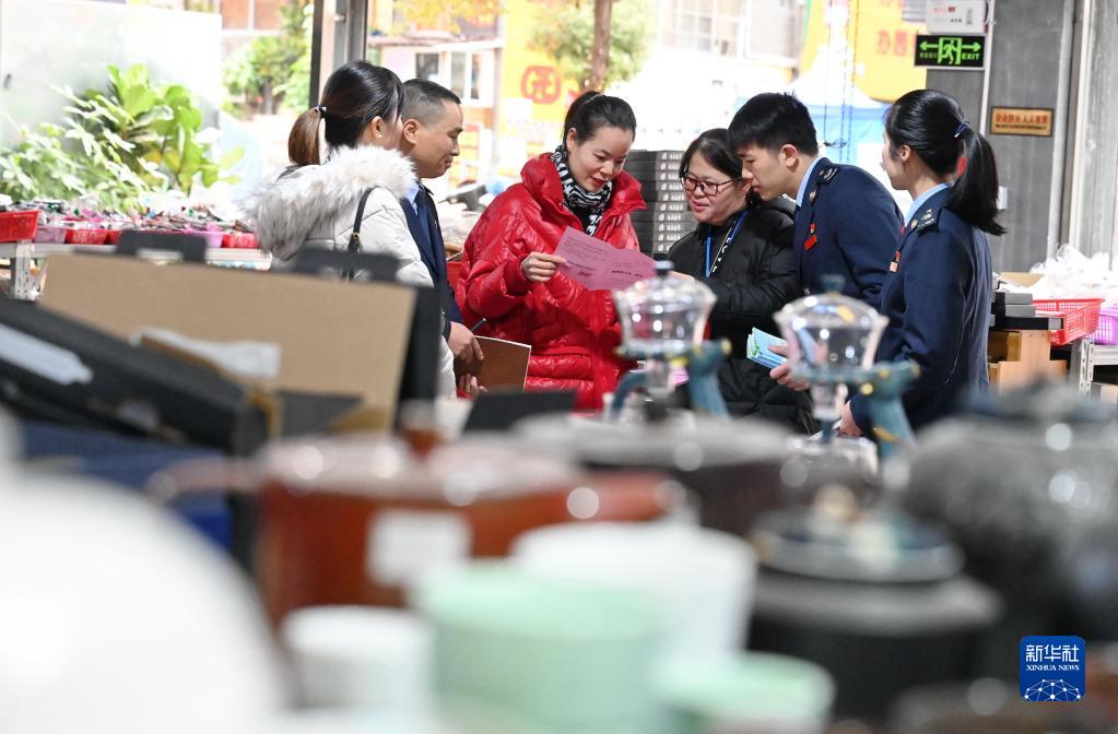2020年12月17日,在福建省德化县,税务工作人员向一家电商企业负责人(左三)宣传介绍疫情防控期间小微企业的税收优惠政策。新华社记者 林善传 摄