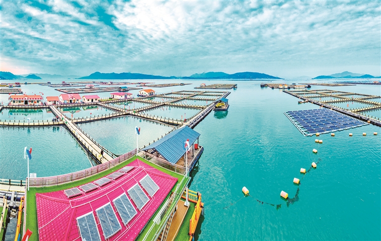 近来,位于三都澳白基湾的三都澳食品有限公司塑胶网箱养殖基地的光伏项目引人注目。该光伏基地日发电量达300千瓦时,既满足了该处渔民的日常生产生活用电,又满足了养殖生产饵料机“柴”改“电”。 依托海上养殖综合整治形成的优美景观和良好生态环境,目前,我市在白基湾等海域建成了5个“风·光·储·充·用”微电网示范项目,为海上生产生活提供绿色能源,为实现“碳达峰、碳中和”目标作出宁德贡献。 闽东日报记者 李民雄 摄