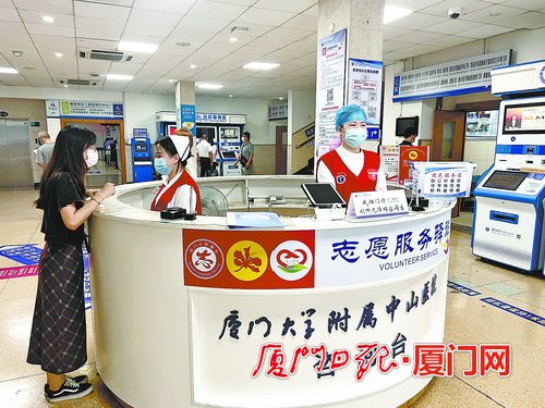 在厦门大学附属中山医院,志愿者为群众提供贴心导医服务。