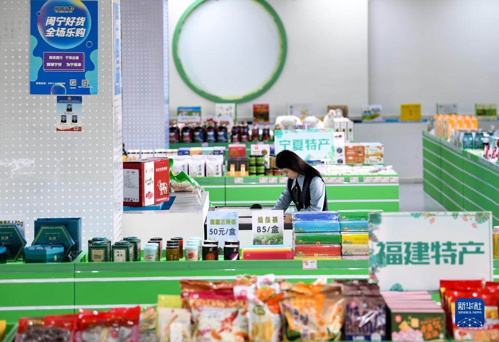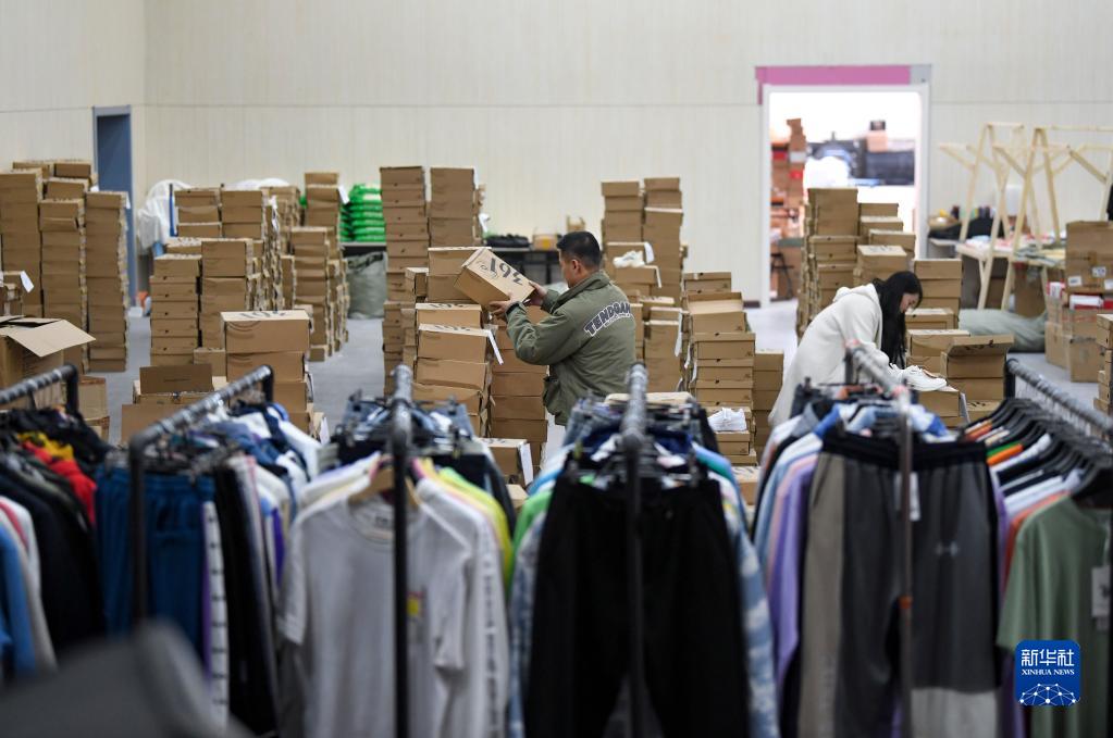 12月9日,工作人员在狮城宁好电商网批(西部)运营基地展销区整理货物。