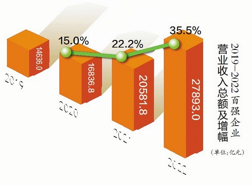 百强企业年营业收入总和稳步上升,今年达到27893.0亿元,同比增长35.5%,较2019增长90.6%。收入突破100亿元企业有29家,突破200亿元的企业有14家,分别比2019年增加8家和3家,呈现上升趋势。
