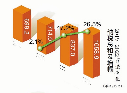 百强企业纳税总和达1058.9亿元,同比增长26.5%,纳税总和及增幅均达到历年最高。纳税额在5000万元以下的企业29家,纳税额在5000万元-1亿元的企业17家,纳税额在1亿元-5亿元的33家,纳税额在5亿元以上的21家。在连续上榜的72家企业中,有16家企业的纳税总额连续4年保持正增长。