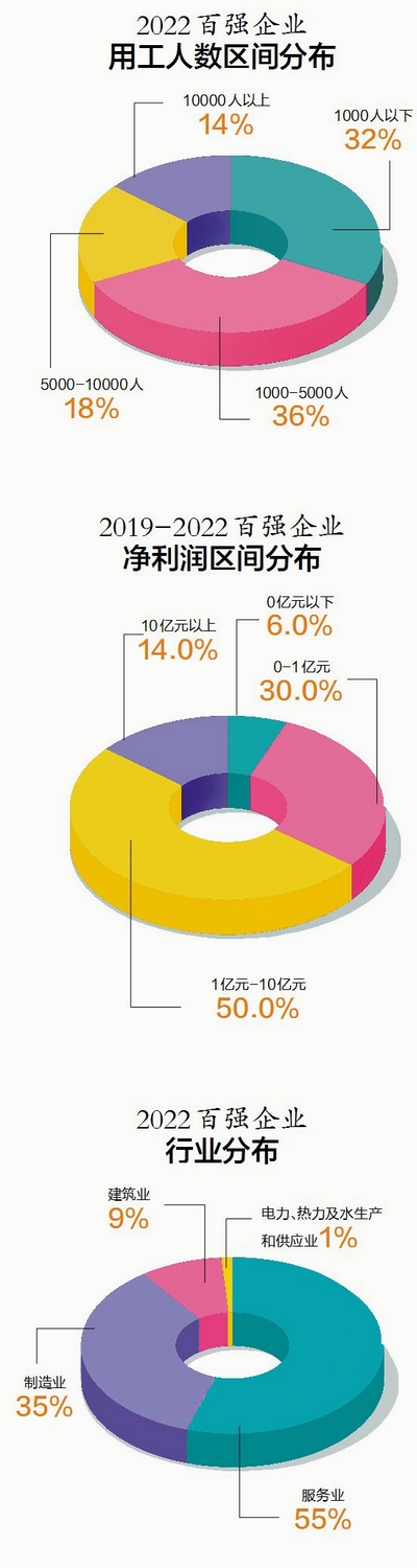 就业是最大的民生,2022百强企业用工人数总和达到46.3万人,其中制造业十强企业用工人数占百强企业用工数的12.7%,服务业十强企业用工人数占百强企业用工数的25.0%,呈现头部企业对稳就业的积极贡献。连续上榜的72家企业中,有16家企业连续4年用工人数保持正增长。