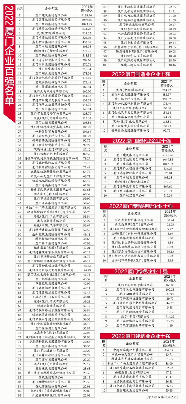 和往年不同,今年还新增了建筑业企业十强。同时出炉的五个子榜单,分别是2022厦门制造业企业十强,前三强为戴尔(中国)、盛屯矿业、厦门钨业;2022厦门服务业企业十强名单,前三强为建发集团、国贸控股、象屿集团;2022厦门新兴产业专精特新企业十强,前三强为科之杰新材料集团有限公司、开发晶照明(厦门)有限公司、厦门狄耐克智能科技股份有限公司;2022厦门绿色企业十强,前三强为厦门天马微电子有限公司、厦门宏发电声股份有限公司、厦门ABB开关有限公司;2022建筑业企业十强,前三强为中建四局建设发展有限公司、中交一公局厦门工程有限公司和福建省九龙建设集团有限公司。