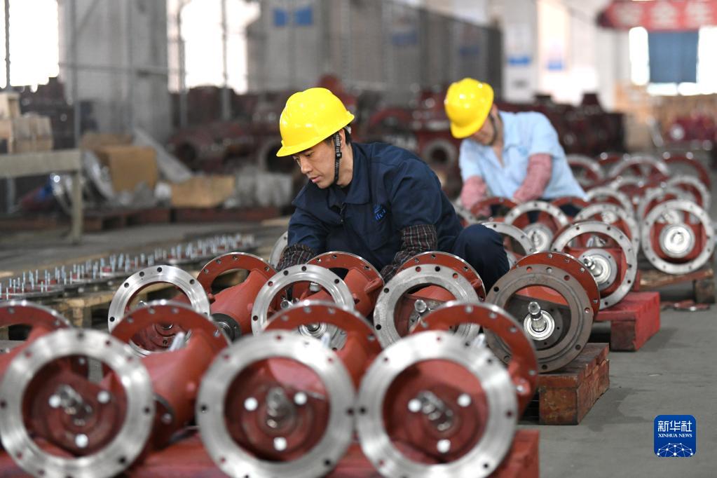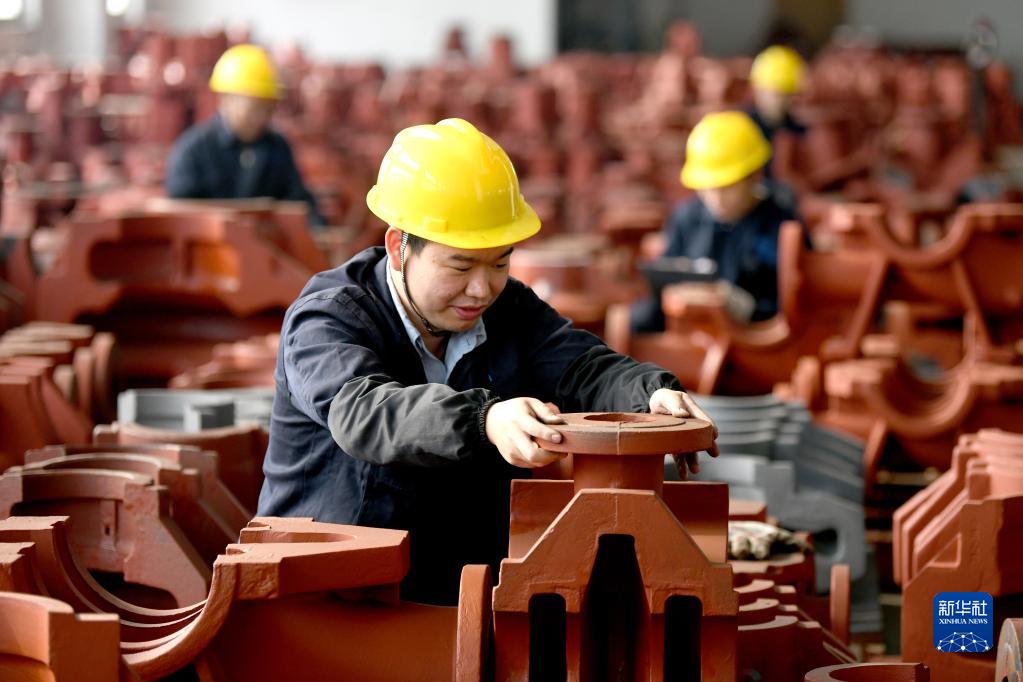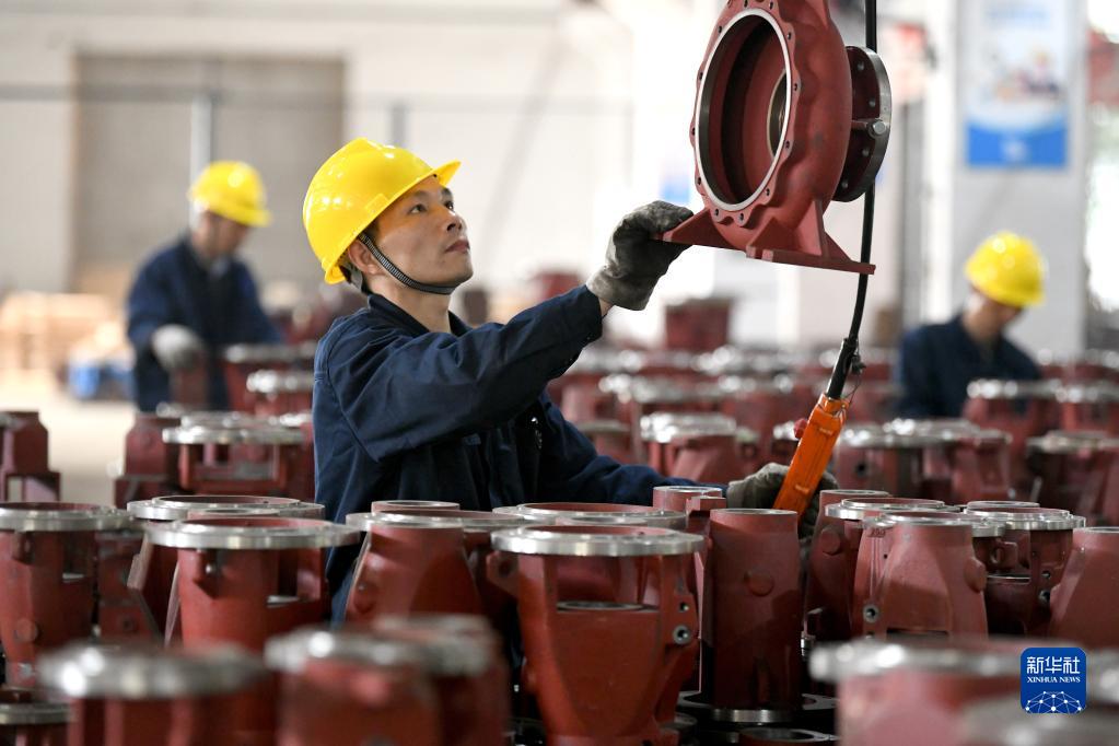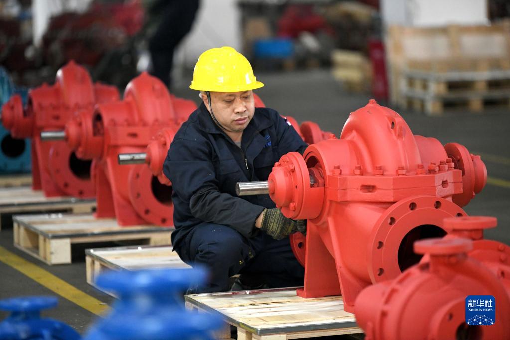 2月13日,工人在福建福州闽侯县的毅飞泵业(福州) 有限公司生产线上吊装水泵部件。新华社发(王旺旺摄)