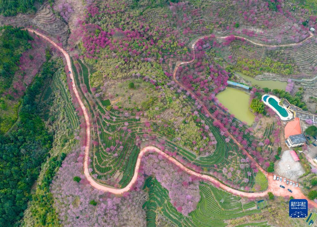 2月12日,位于福建省南靖土楼景区的紫云山生态园,满山樱花尽情绽放(无人机照片)。新华社发(张旭摄)