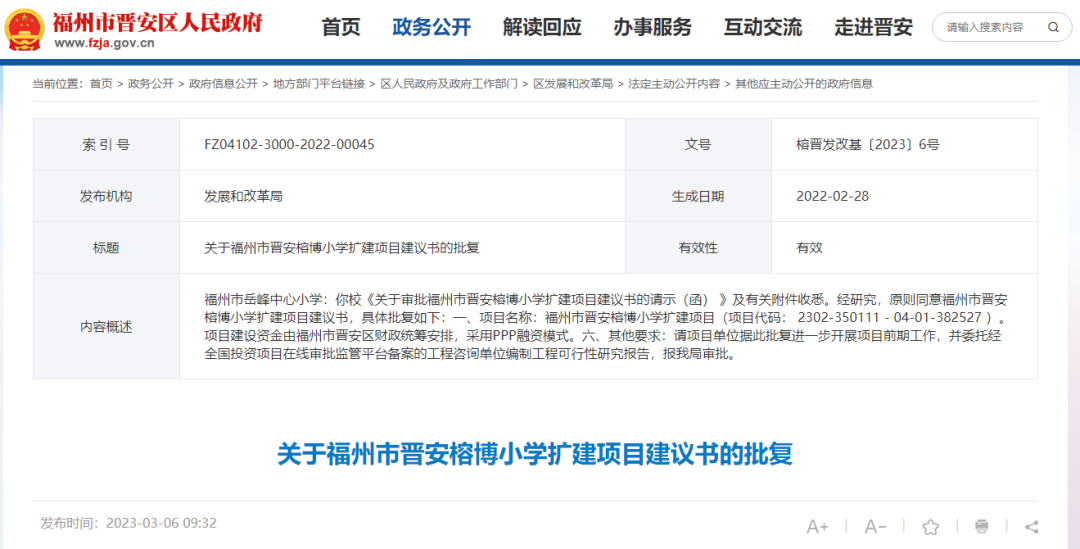 近日,晋安区政府网站发布关于福州市晋安榕博小学扩建项目建议书的批复。