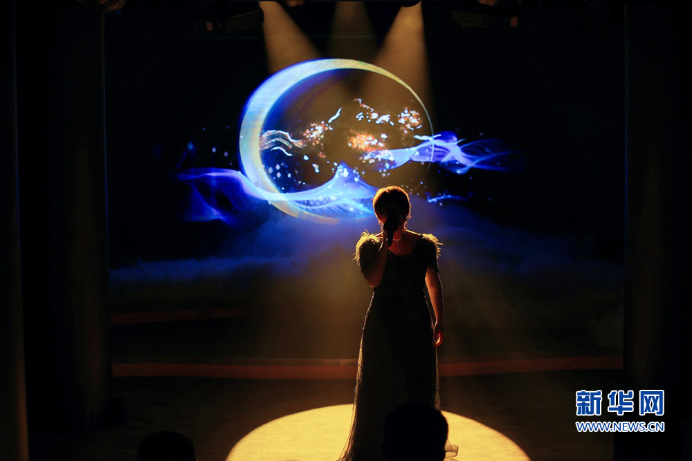这是展演现场,一名歌手基于全景艺术科技进行现场音乐表演。新华网 刘默涵 摄