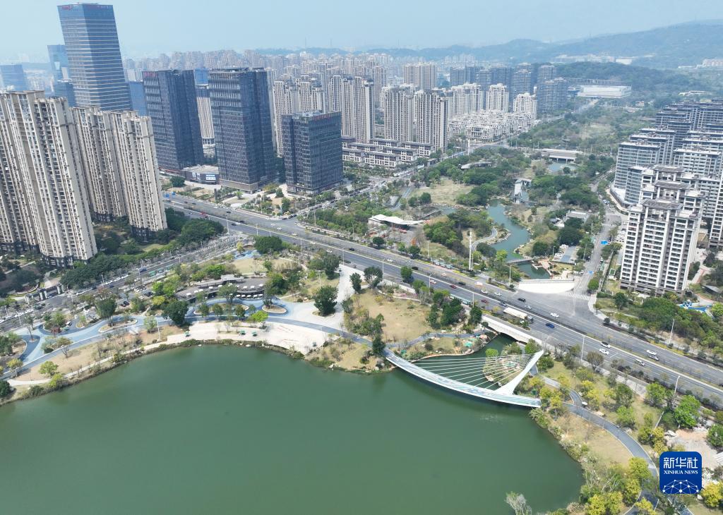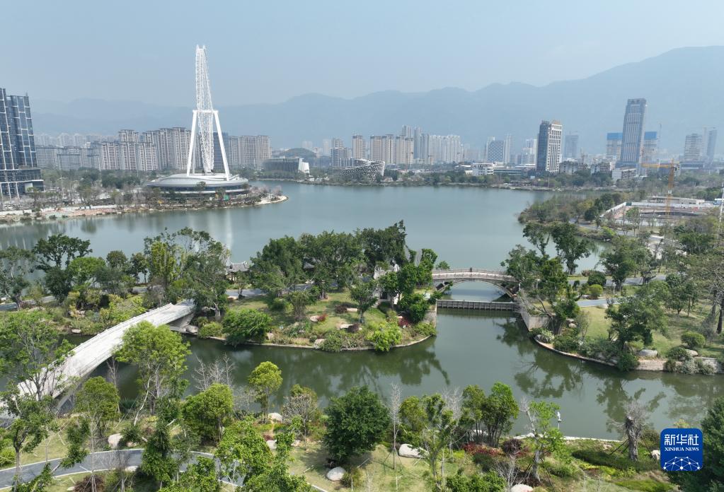 人工开挖的福州晋安湖是城区调蓄库容较大的生态湖,可实现防洪调蓄、生态补水、排水及湖内循环活水功能(3月22日摄,无人机照片)。新华社记者 林善传 摄