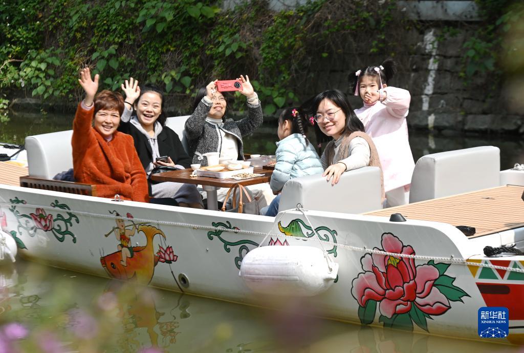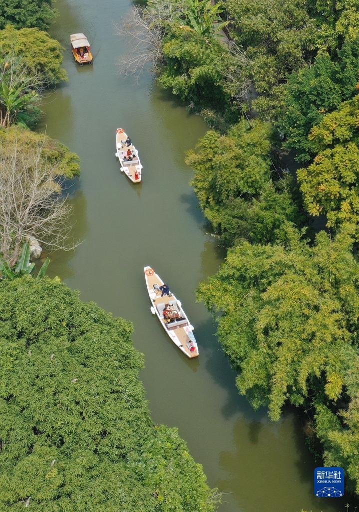 2月25日,游客乘船游览福州白马河(无人机照片)。新华社记者 林善传 摄