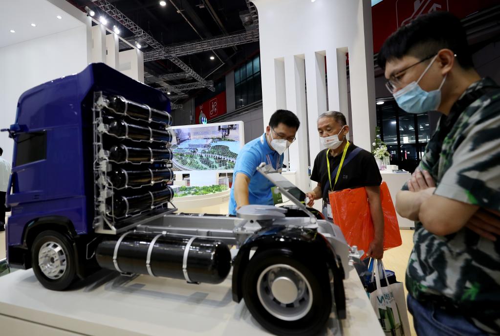 工作人员(左)向参观者介绍一个重型卡车储氢系统。新华社记者 方喆 摄