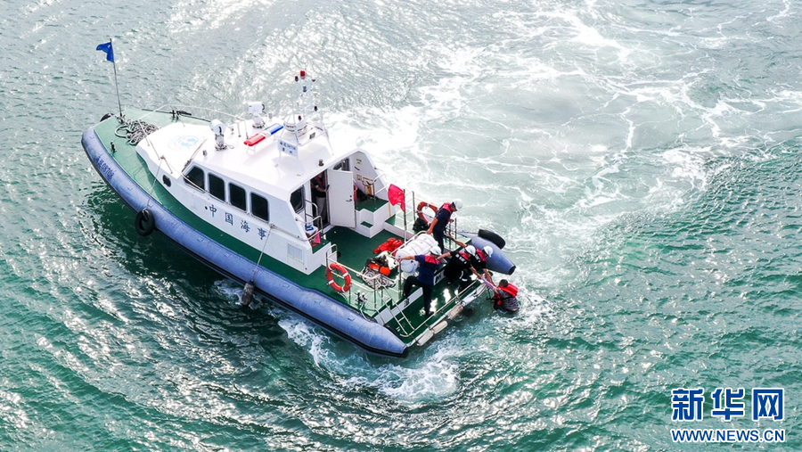 6月26日,海上应急演练现场,漳州海事局救援人员在营救落水船员(无人机照片)。新华网 肖和勇 摄