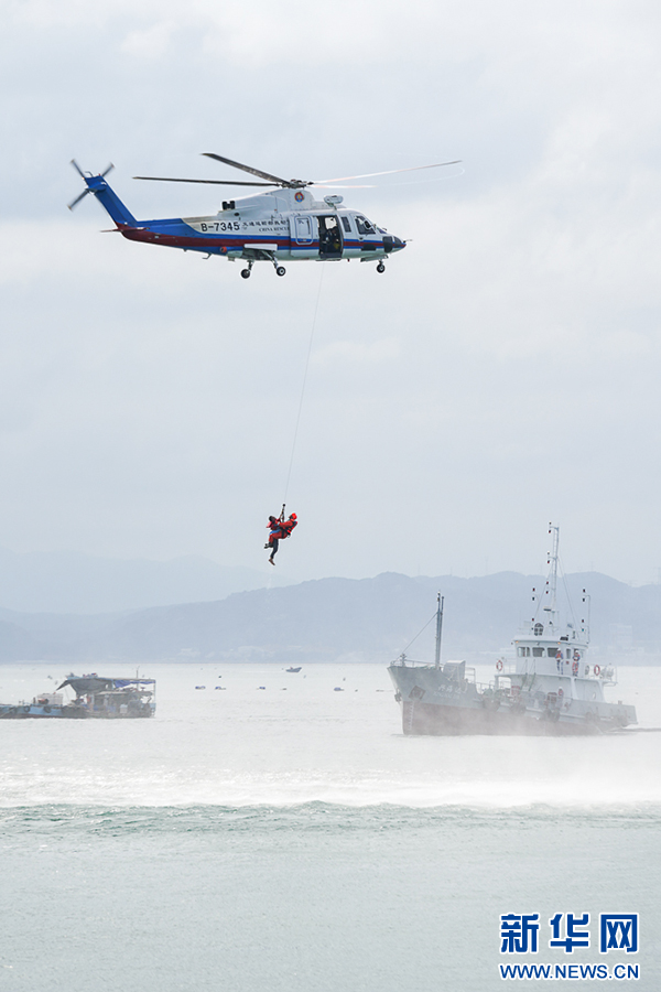 6月26日,海上应急演练现场,救助直升机救起第二名落水船员。新华网 肖和勇 摄