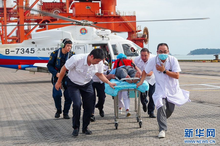 6月26日,海上应急演练现场,直升机落地后,医护人员转运落水船员前往医院救治。新华网 肖和勇 摄