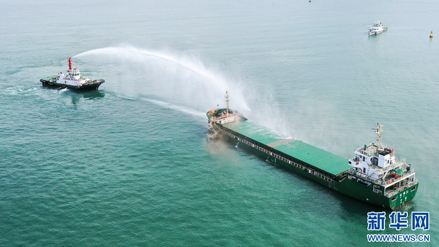 6月26日,海上应急演练现场,消防拖轮在喷水灭火(无人机照片)。新华网 肖和勇 摄