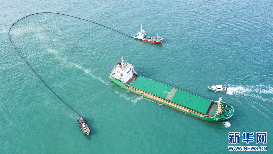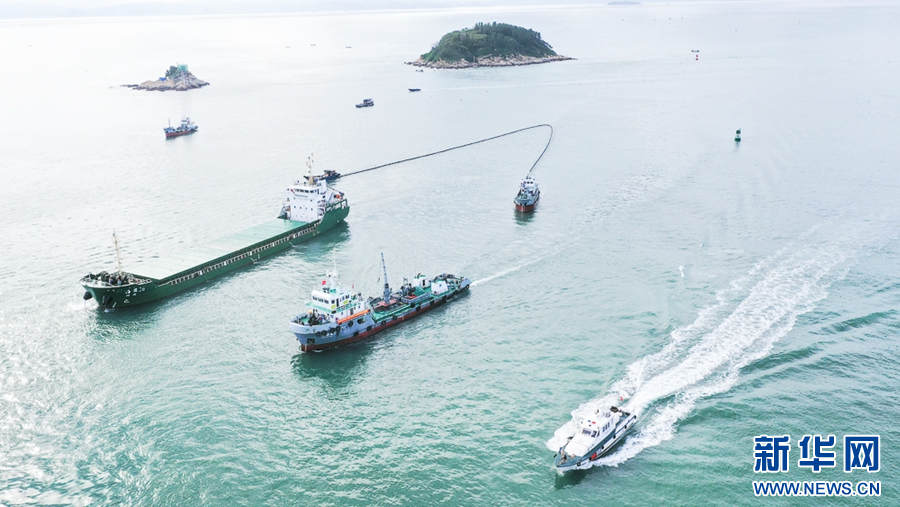 6月26日,海上应急演练现场,救援船只在布放围油栏,进行防污围控(无人机照片)。新华网 肖和勇 摄