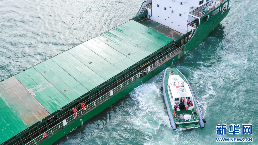6月26日,海上应急演练现场,应急人员登船开展应急处置(无人机照片)。新华网 肖和勇 摄