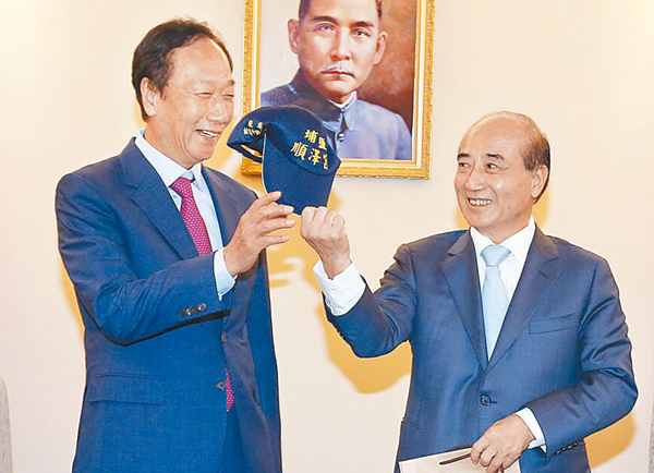 图为郭台铭日前拜会王金平并赠送月饼,王回赠郭帽子。(图片来源:台湾“中时新闻网”)