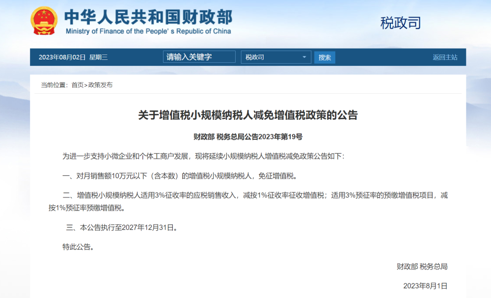 关于增值税小规模纳税人减免增值税政策的公告 财政部 税务总局公告2023年第19号 为进一步支持小微企业和个体工商户发展,现将延续小规模纳税人增值税减免政策公告如下: 一、对月销售额10万元以下(含本数)的增值税小规模纳税人,免征增值税。 二、增值税小规模纳税人适用3%征收率的应税销售收入,减按1%征收率征收增值税;适用3%预征率的预缴增值税项目,减按1%预征率预缴增值税。 三、本公告执行至2027年12月31日。 特此公告。财政部 税务总局2023年8月1日网页截图 上一篇 下一篇