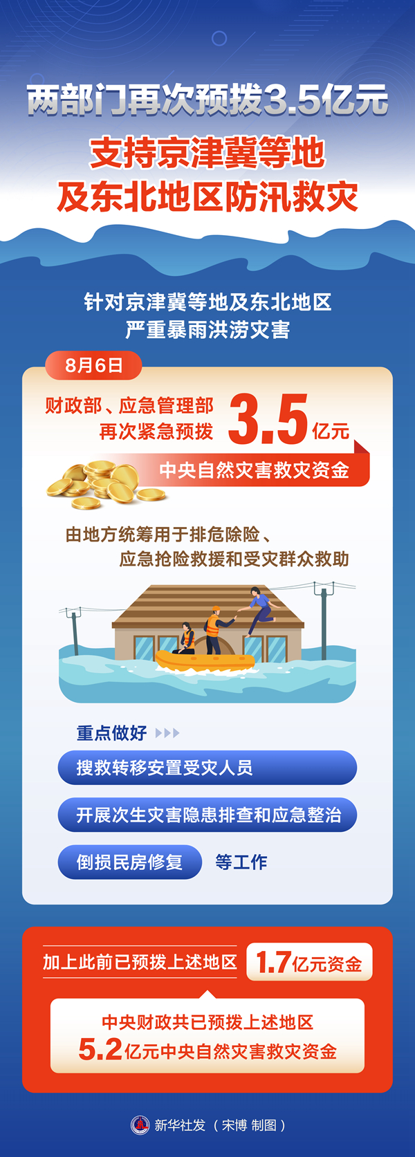 新华社北京8月6日电 针对京津冀等地及东北地区严重暴雨洪涝灾害,财政部、应急管理部6日再次紧急预拨3.5亿元中央自然灾害救灾资金,由地方统筹用于排危除险、应急抢险救援和受灾群众救助,重点做好搜救转移安置受灾人员、开展次生灾害隐患排查和应急整治、倒损民房修复等工作。