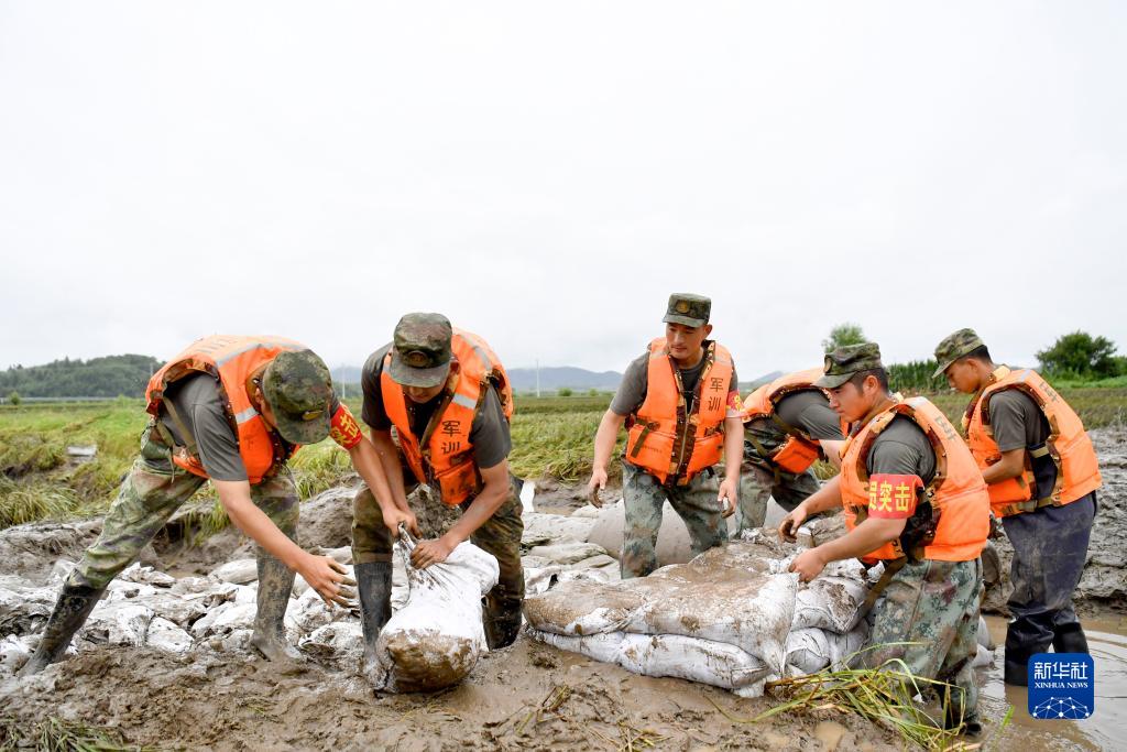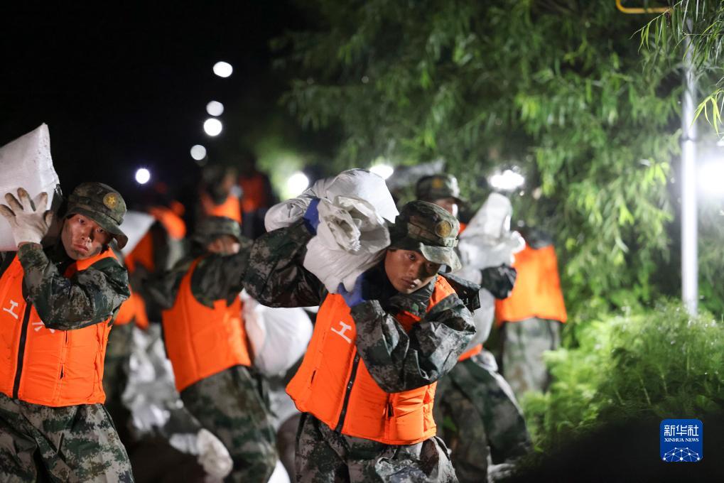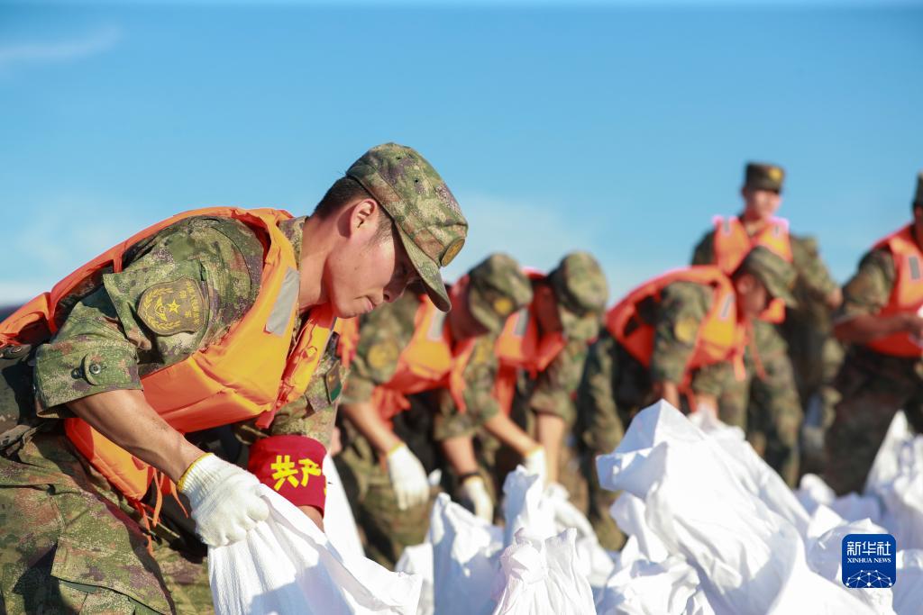 北部战区陆军某旅官兵在舒兰市金马镇执行加固堤坝任务(8月13日摄)。新华社发(沈旭辰 摄)